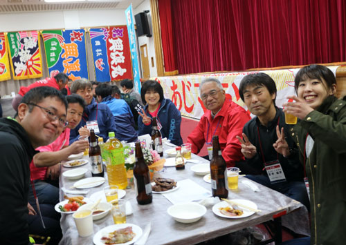コース中のエイドステーションでは、御所浦特産の海の幸や柑橘類などを準備しておもてなしをしており、ランナーも足を止めて島の味を楽しんでいます。ゴール後は陸上自衛隊の支援で入浴場が準備され、夜には島の人たちも混ざり交流会も行われます。
